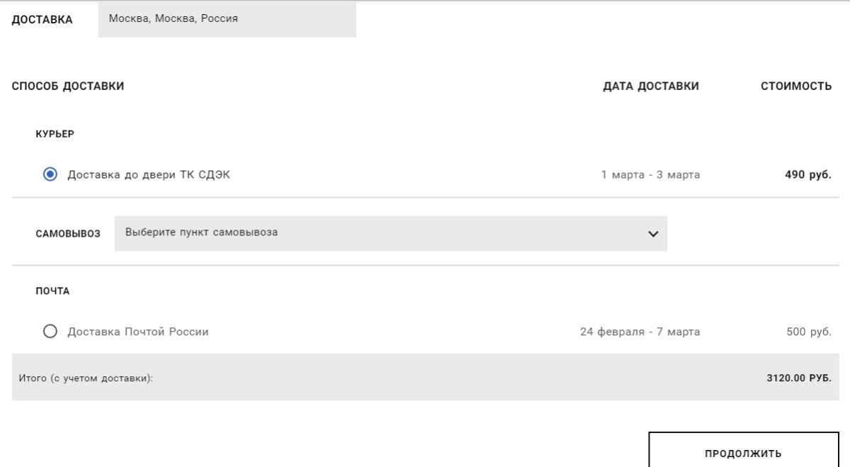 4. Далее в корзине нужно указать Ваш город, выбрать способ доставки и нажать кнопку "ПРОДОЛЖИТЬ".